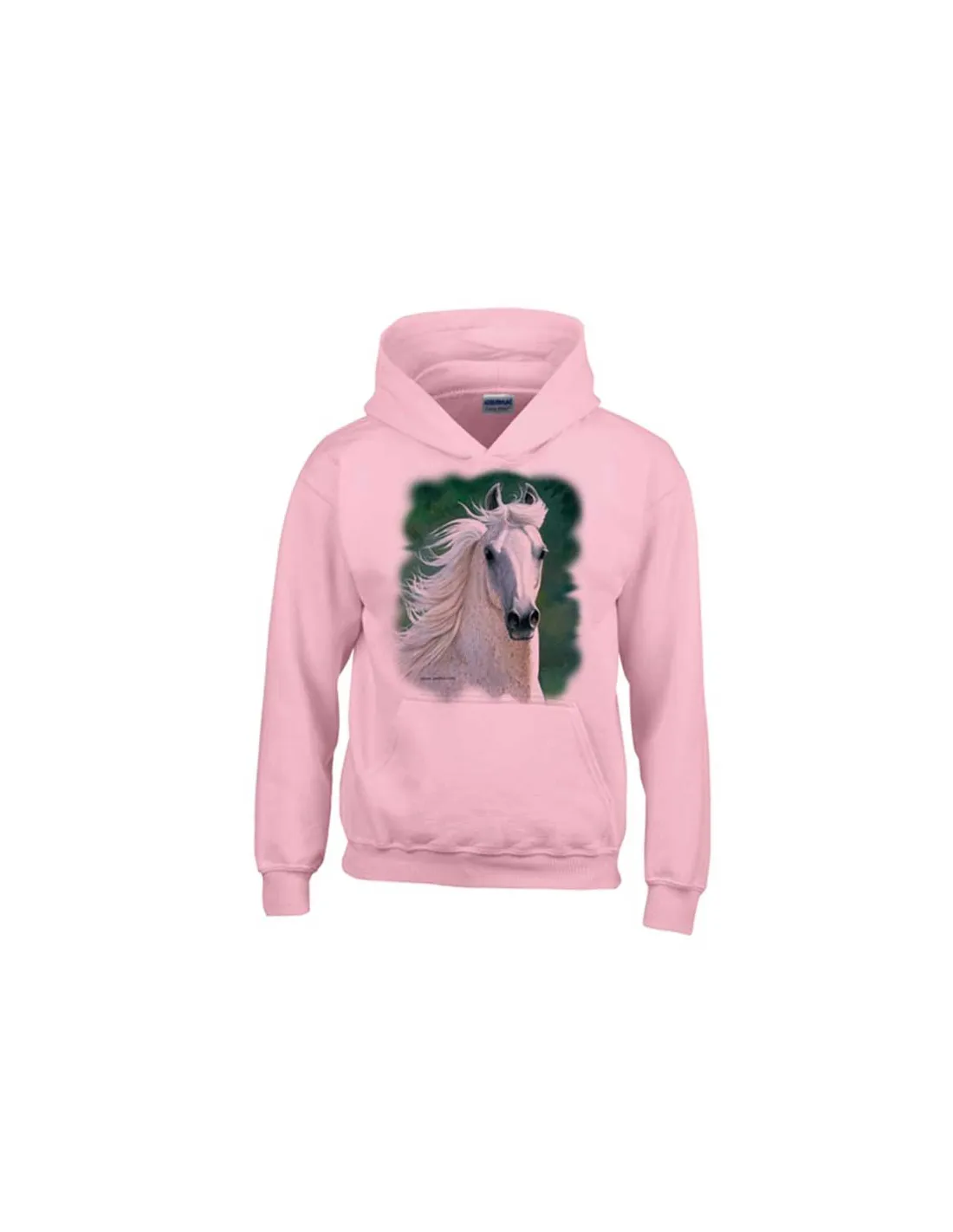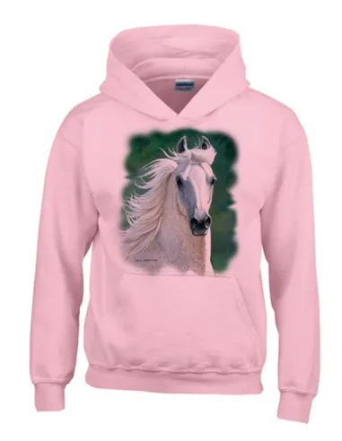 Orné d'une magnifique illustration d'un cheval arabe blanc, ce sweat-shirt à capuche avec poche ventrale "kangourou" offre une allure décontractée et tendance. Sa composition 50% coton et 50% polyester assure une douceur et une résistance idéales pour les enfants actifs.