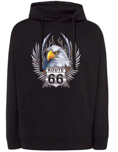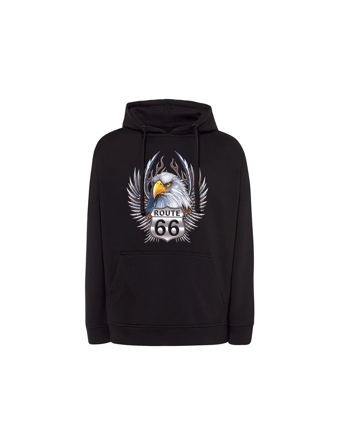 Ce sweat décontracté en 65% polyester et 35% coton, avec capuche et poche kangourou, affiche le motif aigle et le panneau de la route 66. Confortable, durable et facile à porter.