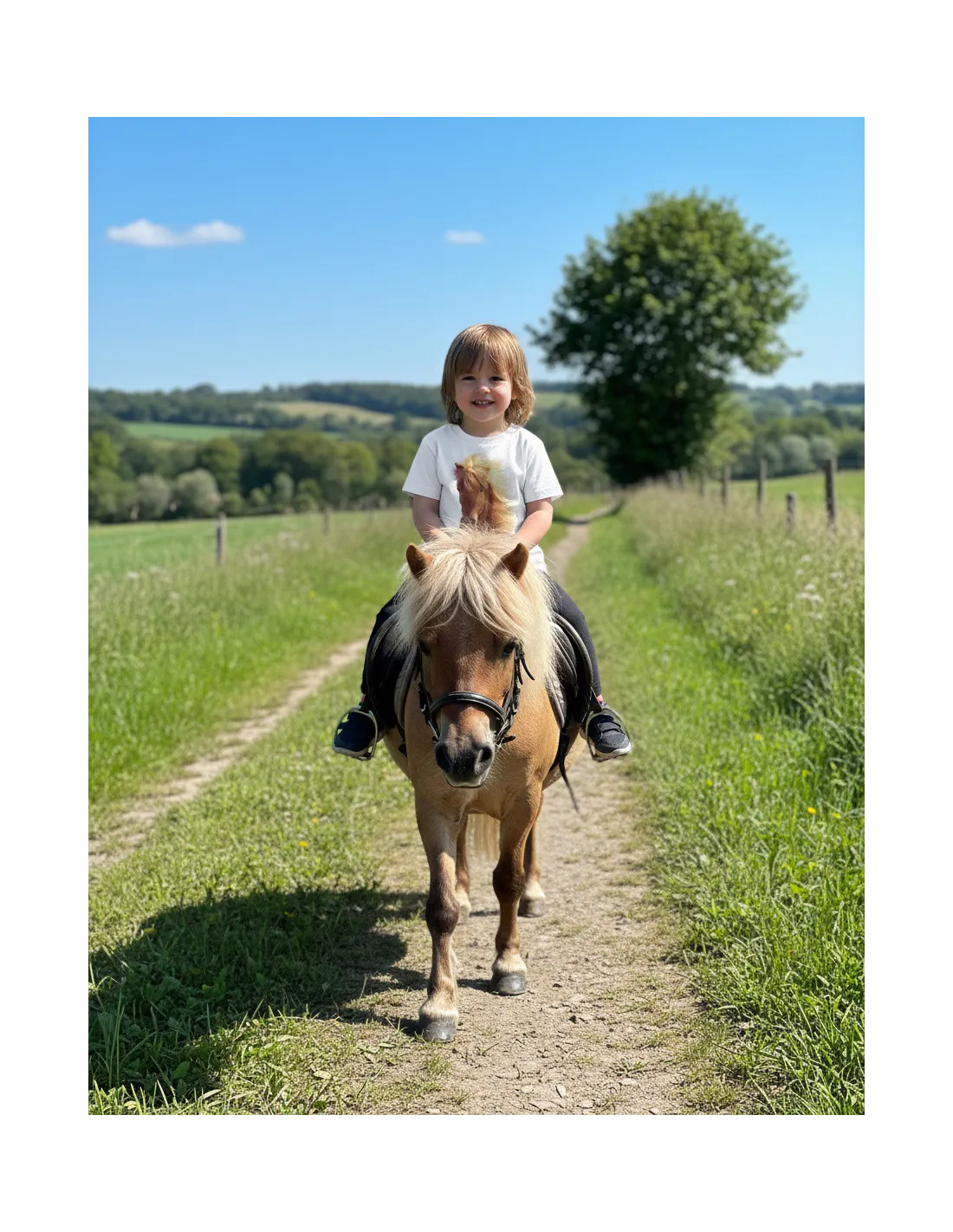 Avec un joli poney Shetland sur le devant du t-shirt.