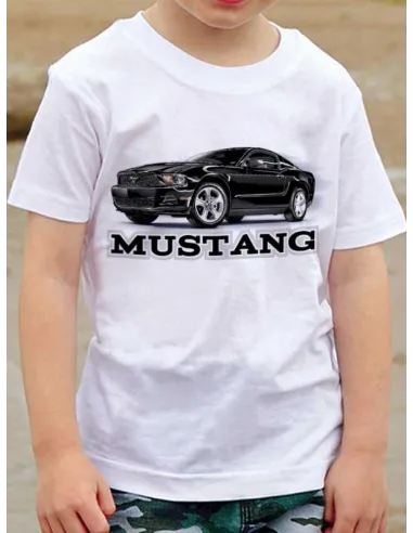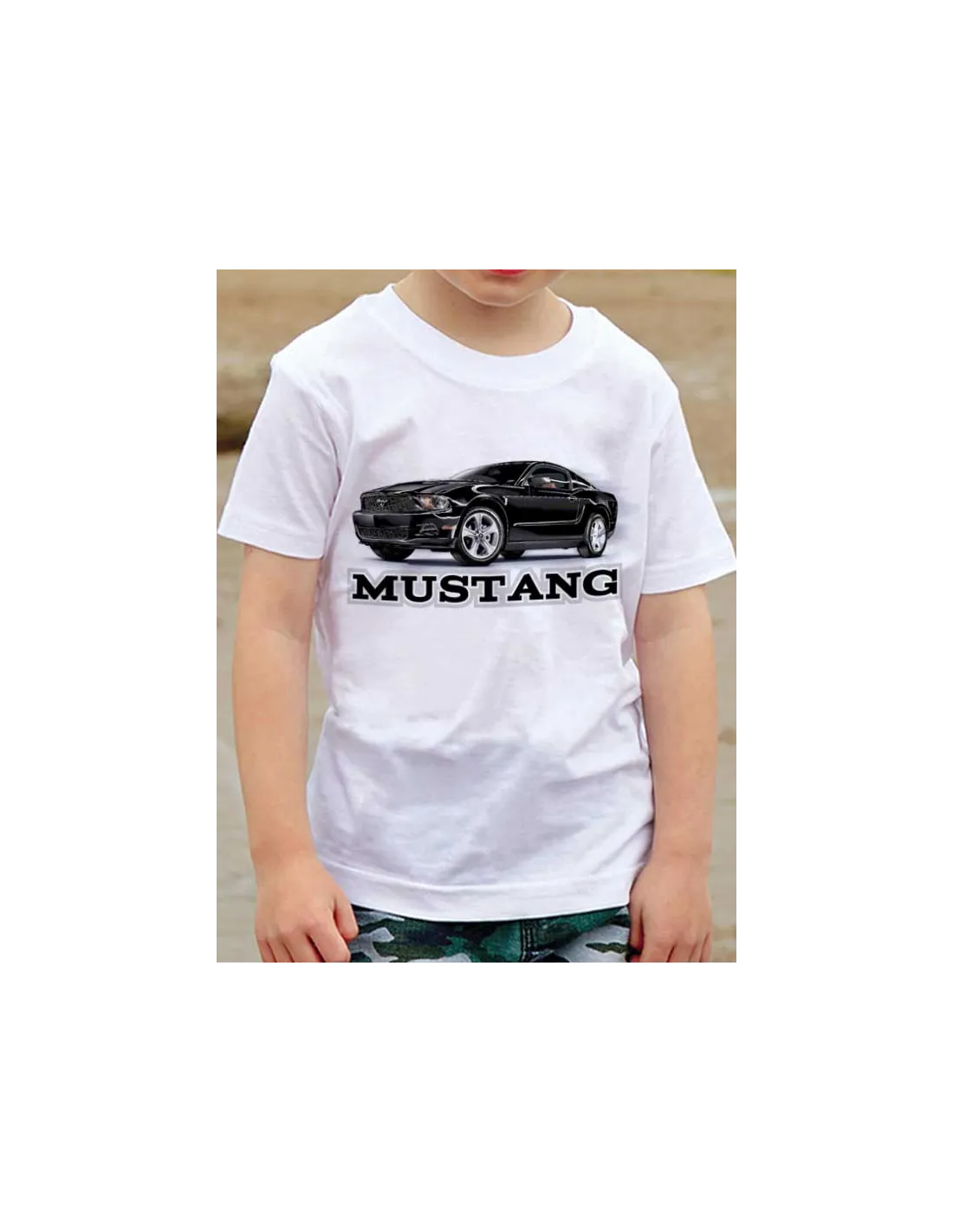 T-shirt blanc pour enfant avec une superbe voiture. La Mustang couleur noire.