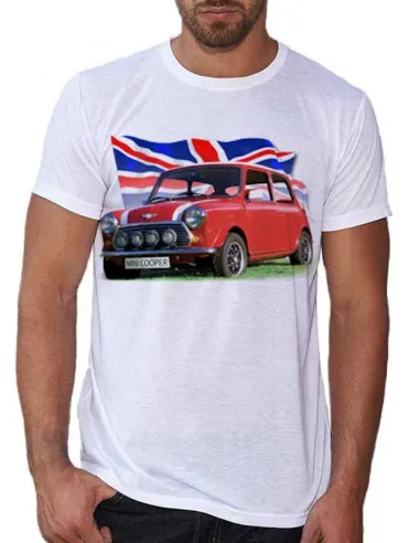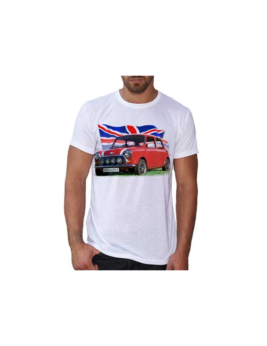 T-shirt blanc pour homme avec une Austin Mini Cooper rouge.