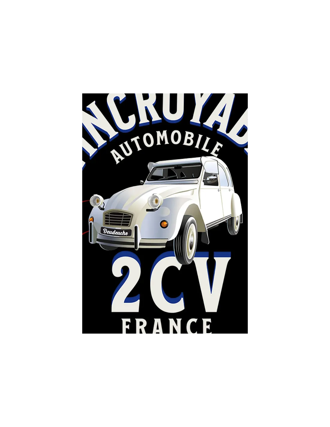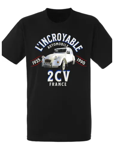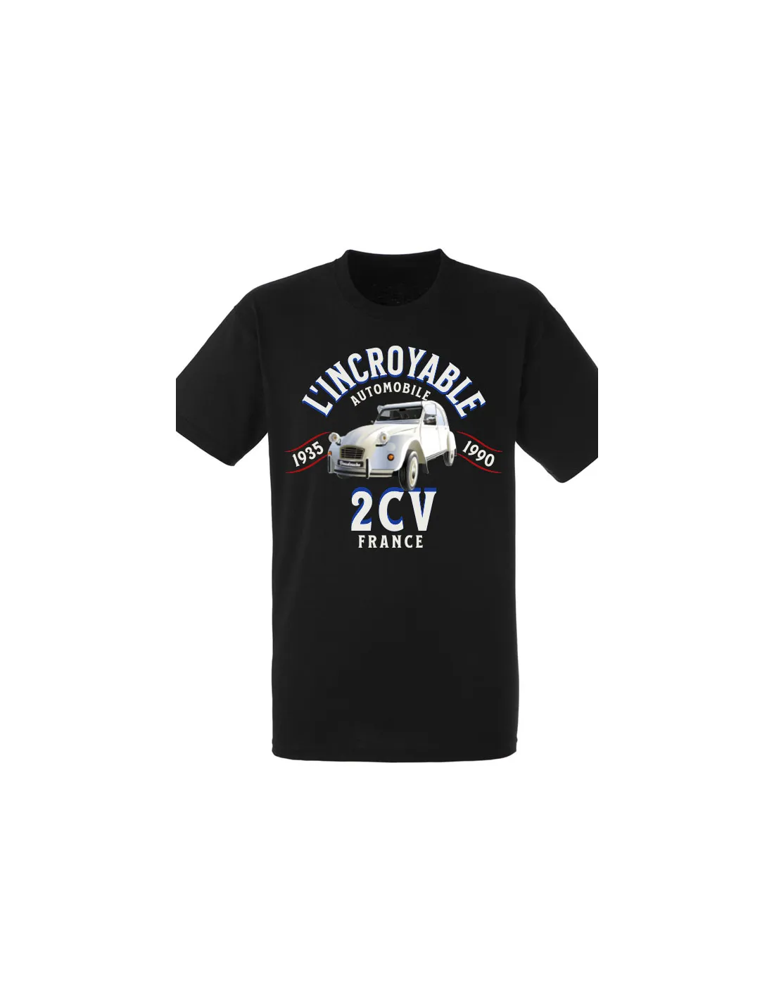 Motif Citroën 2CV imprimé en France sur un T-shirt noir homme; coton doux, coupe décontractée, style vintage et moderne, confort pour la journée.