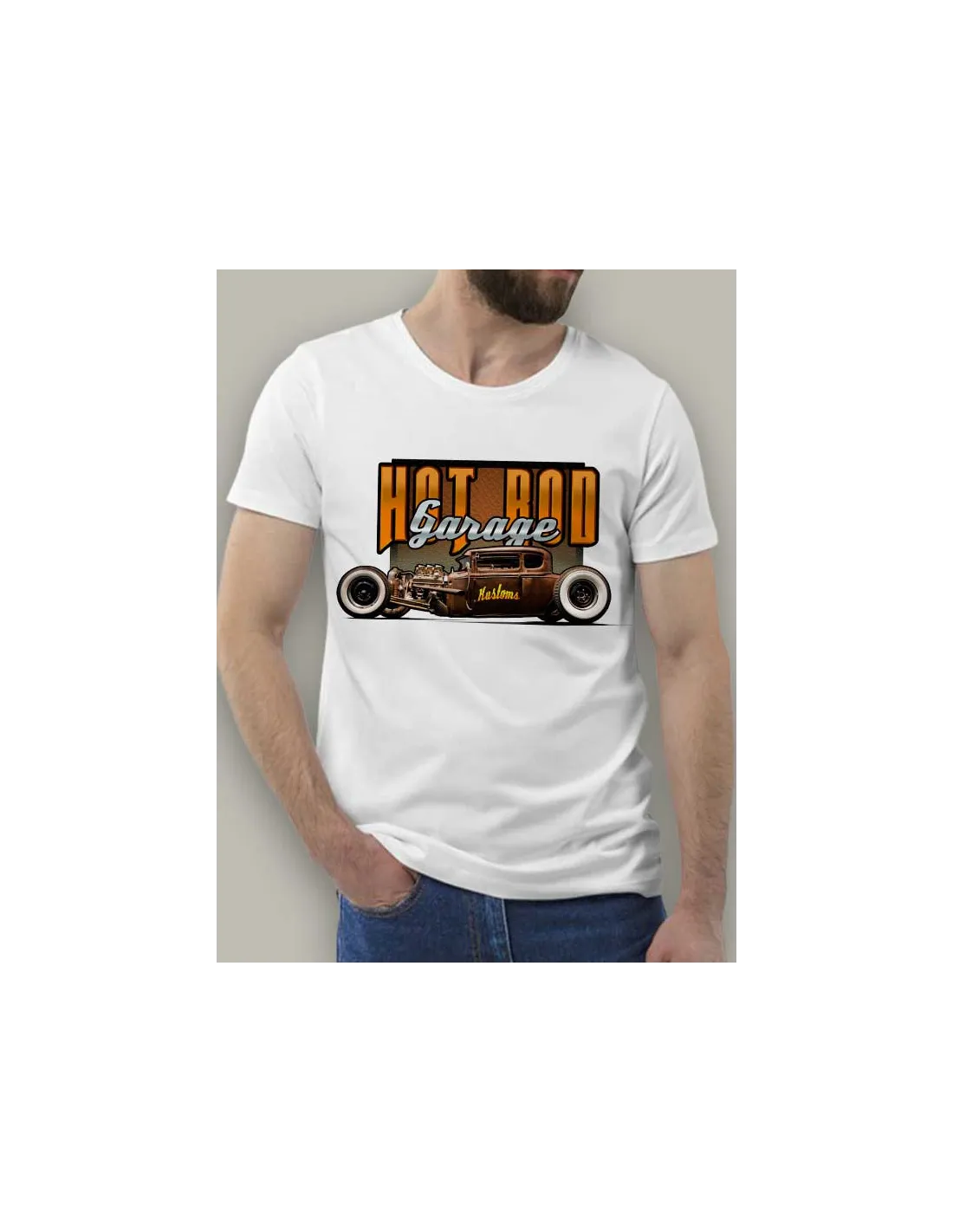Tee-shirt homme avec motif Hot-Rod sur voiture customisée, impression sublimation en France, polyester léger, couleurs intenses et confort sport, prêt pour la route.