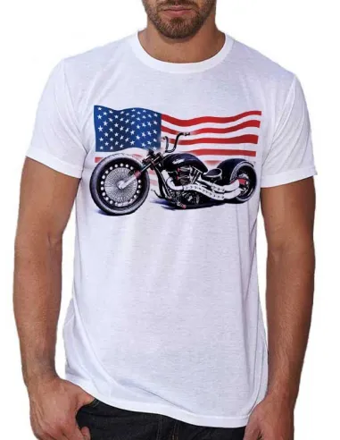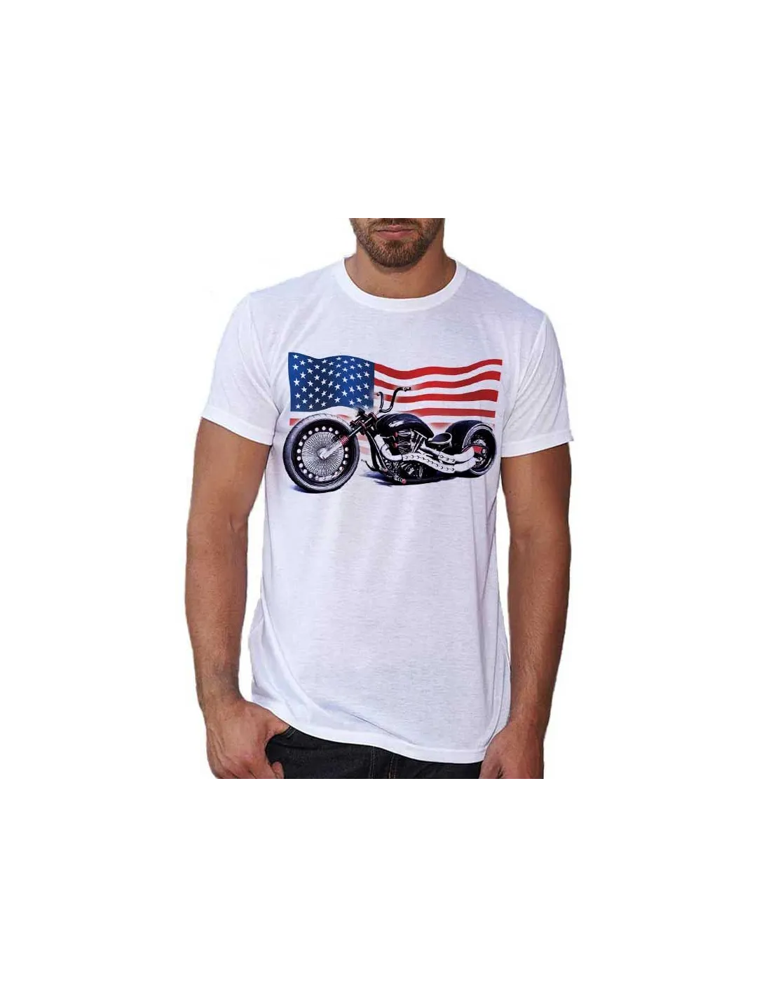 Motif moto Custom chopper sur un t-shirt en polyester léger. Manches courtes, col rond; imprimé en France. Cadeau original, qualité et livraison rapide.