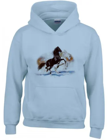 Sweat rose enfant, 50/50 coton/polyester, motif Deux chevaux cabrés ; confort généreux, durable et facile à associer avec d'autre vêtement. Promo fin de série.