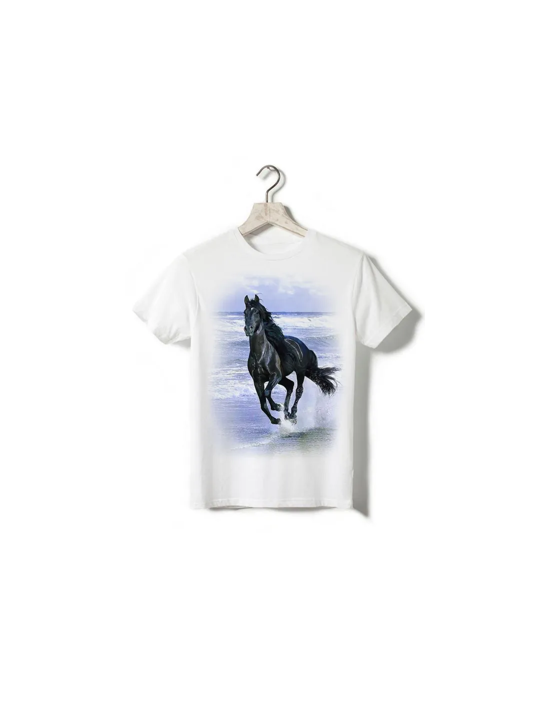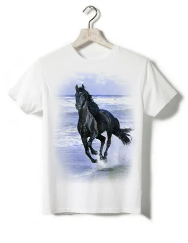 Très joli t-shirt avec motif d'un cheval noir galopant sur la plage.