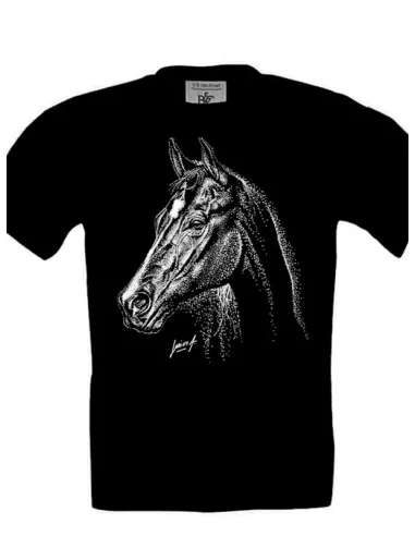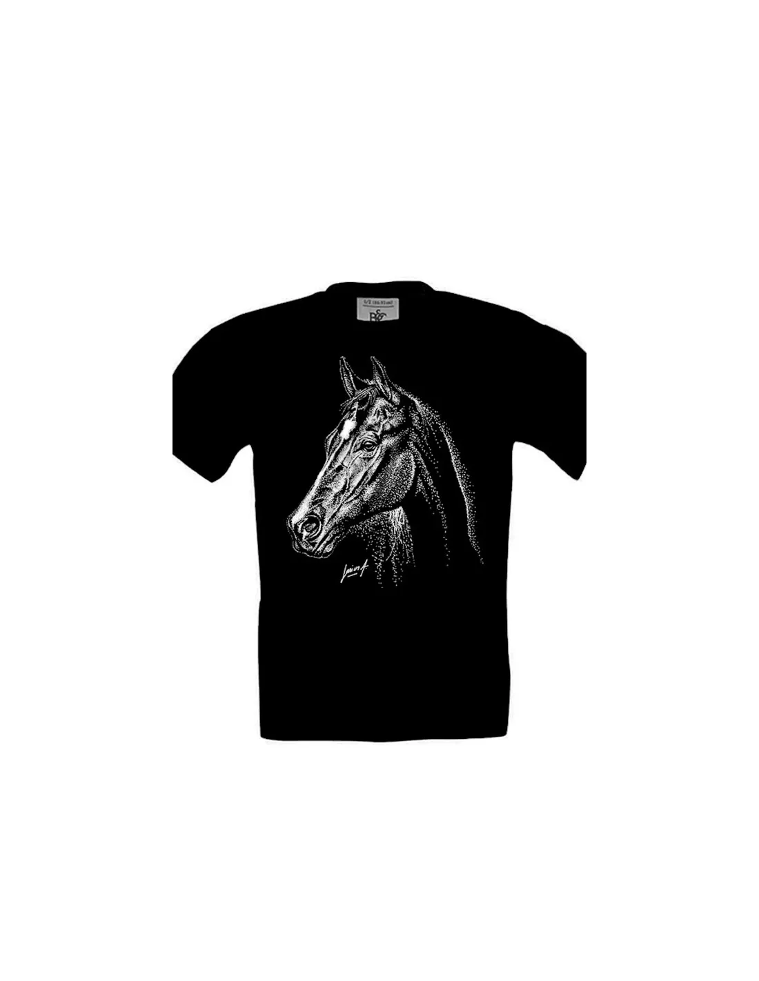T-shirt enfant avec une sérigraphie d'un cheval. Création du motif fait en France.