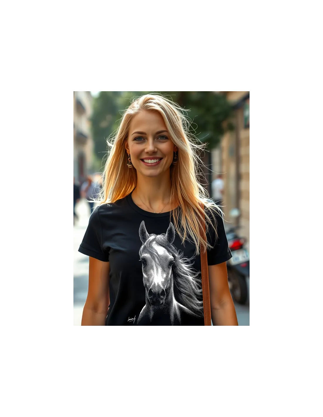 T-shirt noir femme. Cheval blanc