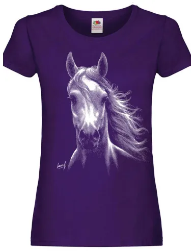 T-shirt pour femme, quatre couleurs au choix avec impression d'un cheval blanc sur le devant.